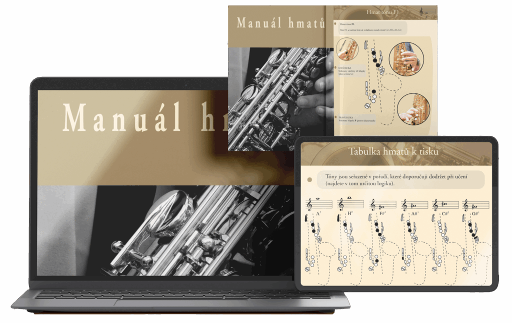 Manuál hmatů je mnohem víc než jen obyčejná tabulka hmatů na saxofon. Je to e-book, který si můžeš táhnout do mobilu, do notebooku nebo si ho prostě vytisknout a mít ho tak vždy u sebe!
